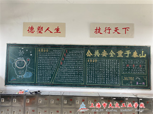 为出好本次黑板报,早在任务下达之初各班班主任就出刊本次安全教育专题黑板报的目的、主题、内容、形式等做了详细的布置。班主任和学生一起努力,他们精心组织,积极搜集黑板报素材,设计版面,并利用课余时间编写。黑板报涉及的内容包括防疫安全、交通安全、食品安全、网络安全、实训安全、校园安全用电安全、用火安全、安全常识等。作为学校要安全警钟长鸣,安全教育长抓不懈!没有安全,一切都无从谈起!现在疫情防控已进入常态化,安全教育工作显得更加重要!