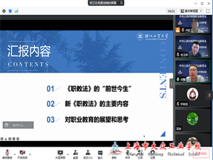 刘晓从《职教法》的“前世今生”、新《职教法》的主要内容和对职业教育的展望和思考三方面分享。在《职教法》的“前世今生”讲解中,刘教授梳理了《职教法》出台的历史、修订的过程和修订的主要思路。从“体系”的系统构建、瓶颈突破、体制机制突破和“他山之玉”与“本土实践”四方面解读了新《职教法》的主要内容和变化;又从党的领导、同等重要、统筹管理、体系贯通等十个方面分析了新《职教法》的亮点。针对本次新《职教法》的出台,刘教授以“守正”与“创新”的角度,从强化党对职业教育的领导、凸显新时代我国职业教育发展的主要目标和方向、丰富新时代职业教育的内涵和服务内容、完善了中国特色现代职业教育的体系等八个方面分享了自己关于新《职教法》的观察和心得。