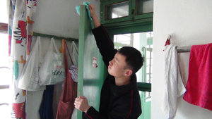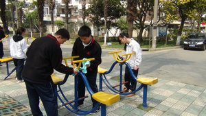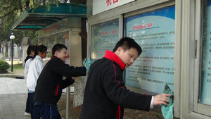 12:10同学们准时出发,高举志愿者大旗,排好两列纵队迈着整齐的步伐走向目的地。很快,同学们就到达了桃园社区。在老师和居委领导的指示下,同学们分成三个小组,第一小组负责小区宣传栏和健身器材的清洁,第二、三小组分别到社区内的一位残疾老人和孤寡老人家里帮忙搞卫生。任务分配好同学们便开始卖力的工作起来,扫地的扫地,擦玻璃的擦玻璃,撕墙纸的私墙纸……没过一会,同学们头上已经满是大汗,可没有一个人喊累。