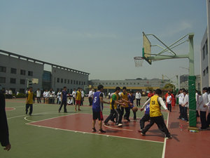 “加油,加油,加油……”“进、进、进……”那小小的篮球在空中划出了一道美丽的抛物线,“哐”篮球精准的投进了。“哇,进了进了”115C班一位女同学激动的叫了起来。“你激动什么呀,那球是他们班的。”另一位同学极其无语的看了一眼这位同学。“啊……”一场激动人心的比赛在这小小的闹剧当中拉下了落幕。最后我们以21:26的差距离开了这个“舞台”,但是这次比赛确给大家留下了深刻的印象,毕竟重在参与。