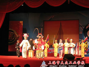 已经习惯了训练、口号、站姿的学生们一下融入了主持人的国粹解说中:“京剧分四行:丑、旦、生、净。”京剧表演艺术家演示了四行,学生们上台体验国粹奥妙,也感受到了表演艺术家们“台上一分钟,台下十年功”的艰辛。之后的《飞虎山》、《三岔头》,《孙悟空大战盘丝洞》学生们如痴如醉,运用之前所学的知识,孙悟空是武生,而蜘蛛精是武旦,道具刀剑在空中飞舞、翻空、旋转,“武”字被完美诠释。学生们充分感受到了中国文化的博大精深,在心底深深为之震叹。