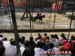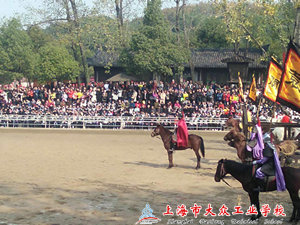第一站,是跑马场,“滚滚长江东逝水,浪花淘尽英雄……”刚进跑马场,耳边就回响起那一首荡气回肠的音乐,让大家仿佛穿越了时空,与三国时期的英雄们来了次亲密接触。最为精彩的要数“三英战吕布”的演出了,演员们以精湛的表演讲述了当年十八路诸侯讨伐董卓时,刘、关、张三兄弟大战吕布的故事,赢得同学们阵阵喝彩。