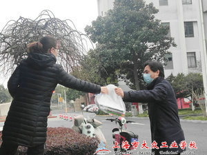 这几天,大众工业学校的校园里活跃着这样一群人的身影:他们为家长测量体温,他们引导家长去领教材的校舞蹈房,他们将每个学生的教材分装打包好,他们将教材交到每一位家长的手里,并确保每一个领教材的家长在整个过程中无需下车,无需亲自动手……