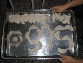 同学们兴高采烈,每个人都很兴奋,自发分成了五个小组。到了食堂后,组长就拿来肉馅、饺皮和碗碟,开始包饺子,我发现同学们的饺子都很好看,也很有新意: