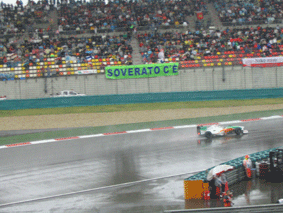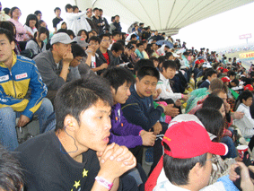 雨依然下着,比赛已经开始了。当赛车飞驰着向看台这边而来是,学生们激动地翘首观看。每当有赛车出现一点状况时,心就随之悬浮。尽管看台上还有雨丝飘散,打湿了学生的头发、衣服,但精彩、热烈的比赛,激发了他们的火热心情,热烈地为喜爱的赛车手加油、欢呼!他们的表现,让一旁的几个老外由衷地点头称赞。