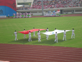 开幕式开始了,一上来就是我们中国的灵魂——武术,而且是一大群孩子演绎的,真是有模有样;接下来的,算是中国的一大特色:无极健身球,是许多鹤发童颜的老人为我们带来的,各个都神采飞扬;看——又一个队伍出场了,这次带来的是年青人的健美操……看到这,突然想起2008年的北京奥运会,在我的心目中,它比奥运会有过之无不及,这方阵中的每一个人都是为了家乡的事业和社会的进步而无私奉献着的。
