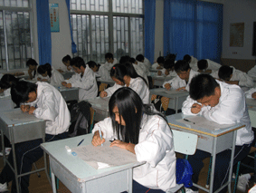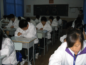 上午八点整,校园一片安静。全校大部分班级学生早已端坐教室,等候监考老师下发考卷。(个别班级不统一安排考试的,照常上课。)学生们拿到考卷,马上就奋笔疾书起来。教室里只听沙沙的书写声。电气部的考场里,每个教室30名左右的学生,都配备了两名教师进行监考。两位老师一前一后,一动一静,偶尔为学生传递一下计算器或橡皮。时而提醒学生抓紧解题。教室外,从校长到教务科的老师在走廊里巡视而过。