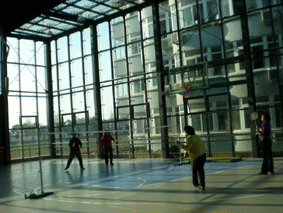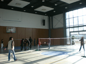 3块网栏前,几组女选手根据抽取的号码开始比赛。从初赛继而晋级到复赛、半决赛直至冲击冠军决赛。虽然各位老师未曾受过专业训练,但运动员表现出了顽强的意志和竞技的精神。网栏前时而羽拍挥舞、时而羽球翻飞、运动员在体育馆里奔走跳跃、健步如飞,回荡着的加油声、喝彩声久久未曾散去,甚至吸引来了其他教学部的各位老师。