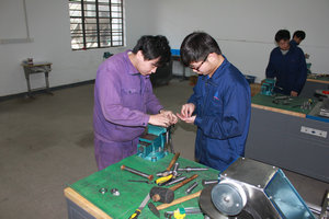 首先让我们看看正在紧张训练的“机械装调”训练场地,学生们正在紧张的进行“主轴变速箱”拆装练习。该项目在2012年全国中等职业学校技能大赛中获得了二等奖,能够获奖是在上海市集训队老师们集体的努力下取得的,现如今教学部大力鼓励让年轻教师冲在前,挑起带教备战明年比赛重任,然而年轻教师的经验以及紧要关头应变能力都需要不断培养和不断积累。