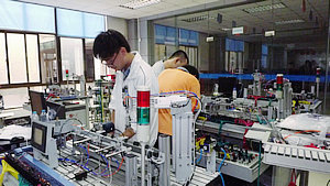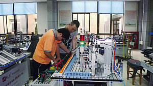 “机电一体化设备安装调试”项目的训练也是大强度的,每套题目完成下来也要历时4小时。选手们每天都要在操作台上不断编程、接线、调试,一刻不停地忙碌着,连午饭都无法按时去吃。每天都是全校师生都吃完了,到下午一点钟了他们才能拖着疲惫的身躯到食堂去用餐。