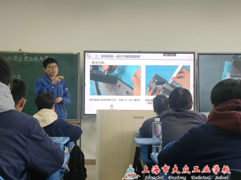 课程伊始,常磊通过展示学生在上次课中出现的零件散乱、装配顺序混乱、零件装反、垫圈错漏等实际问题图片,迅速引发学生共鸣。他引导学生归纳问题根源,并明确本节课的重点——掌握“先稳机架、核心先装、再连运转”的装配逻辑,以及难点——识别并解决座架、滑道“隐性精度问题”导致的运行卡阻。